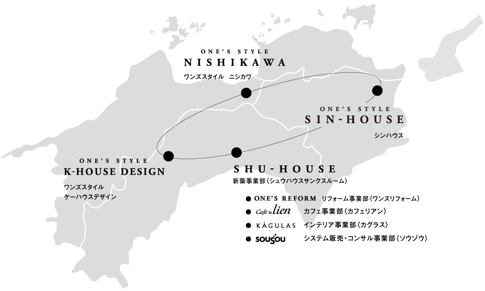 私どもONE’S STYLEグループは、高知県高知市で産声をあげた工務店「シュウハウス工業株式会社」を母体とし、2021年に「株式会社ONE’S STYLE」を設立後、愛媛県四国中央市、高知県高岡郡佐川町、徳島県板野郡藍住町と、四国内に高性能住宅施工会社4拠点を展開しています。
