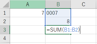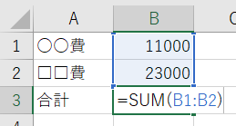 マウスで範囲指定するか直接範囲を入力 【 =SUM(B1:B2) 】