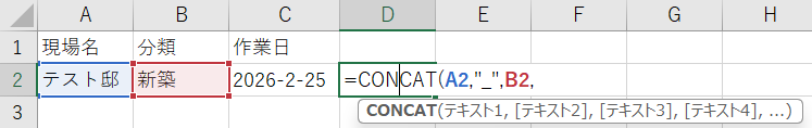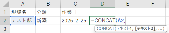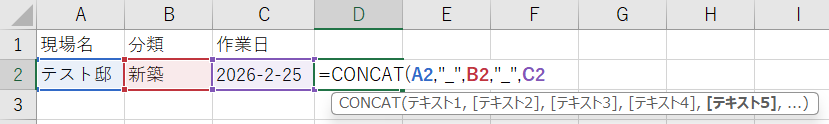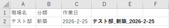 「現場名_分類_作業日」をつなげて出力したい場合等、実務で使いそうな例をご紹介します。