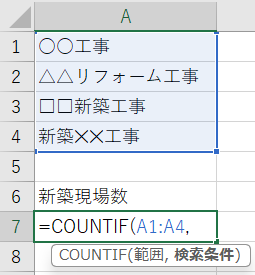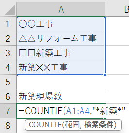 2. 検索したい文字列「 新築 」、の両サイドに「 * 」を付けて入力 【 =COUNTIF(A1:A4,”*新築*“) 】