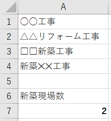 今度は「新築」という文字列が一部に含まれているセルをカウントして見ましょう。