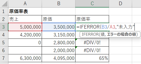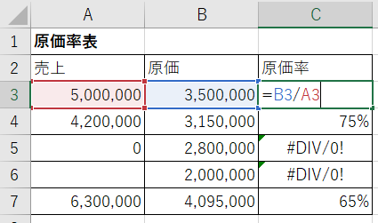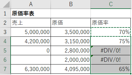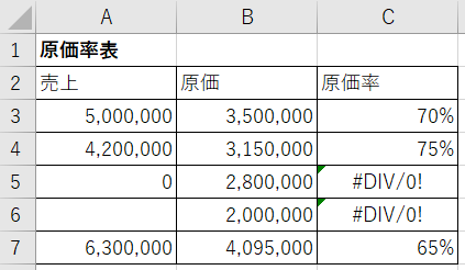 売上が入力されていないと原価率表で「#DIV/0!」が出力される場合があります。