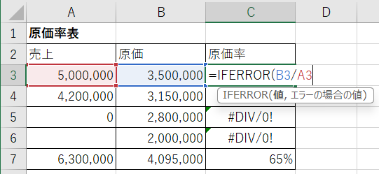 2. 元々あった式の「 = 」の後に「 IFERROR( 」を追加する 【 =IFERROR(B3/A3 】