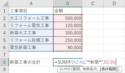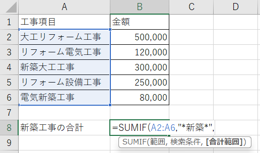 2. 検索する条件「新築」の文字が含まれるものを指定する 【 =SUMIF(A2:A6,”*新築*”, 】