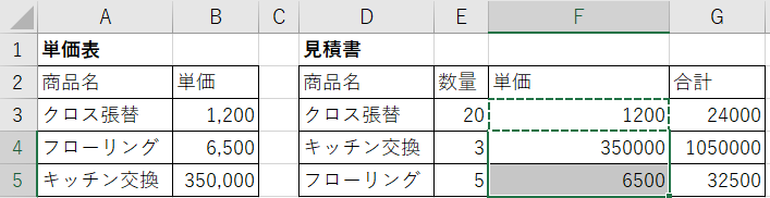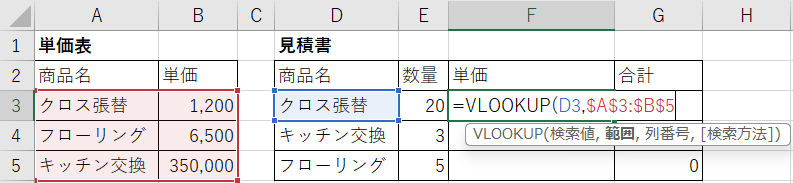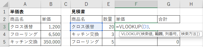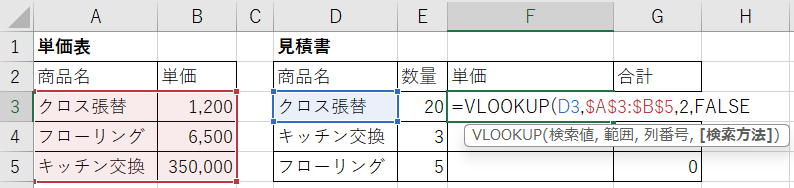 単価表を参照して、見積書に該当する金額を表示する手順を見てみましょう。